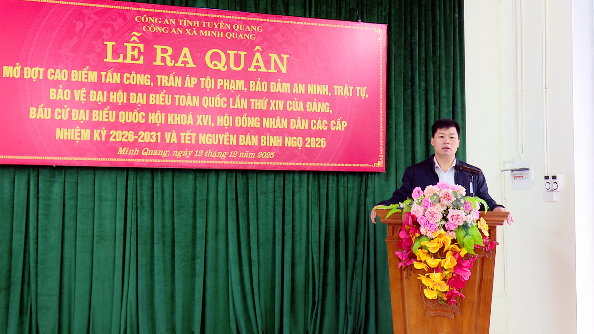 Tại lễ ra quân, đại diện lãnh đạo Công an xã Minh Quang đã quán triệt, triển khai một số nội dung trọng tâm trong Kế hoạch cao điểm trên tinh thần thi đua “ Ba nhất”. Thời gian thực hiện cao điểm từ ngày 15/12/2025 đến ngày 16/3/2026. Việc tổ chức triển khai, thực hiện đợt cao điểm phải bám sát phương châm: “Tập trung phòng ngừa từ sớm, từ xa, từ cơ sở, đi đôi với quyết tâm đấu tranh không khoan nhượng và xử lý nghiêm minh các loại tội phạm, bảo vệ cuộc sống bình yên của Nhân dân, kiến tạo xã hội trật tự, kỷ cương, an ninh, an toàn”. Kịp thời triển khai các biện pháp, đối sách phòng ngừa, đấu tranh hiệu quả các loại tội phạm, tệ nạn xã hội, không để bị động, bất ngờ trong mọi tình huống. Tổng rà soát, nắm, đánh giá lại toàn bộ tình hình địa bàn, các loại đối tượng. Tiếp tục quán triệt phương châm “an ninh chủ động”, tăng cường công tác bảo đảm an ninh cơ sở. Quyết tâm kéo giảm 10% số vụ phạm tội về trật tự xã hội so với cùng kỳ năm 2025 và 3 tháng liền kề. Nâng cao hiệu quả quán lý Nhà nước về ANTT, gắn với triển khai quyết liệt các giải pháp ứng dụng Cơ sở dữ liệu quốc gia về dân cư và Đề án 06 của Chính phủ để phục vụ quản trị xã hội và phòng, chống tội phạm. Phát động mạnh mẽ phong trào Toàn dân bảo vệ an ninh Tổ quốc, vận động Nhân dân tích cực tham gia phát hiện, tố giác, phòng chống tội phạm, tệ nạn xã hội, giữ gìn an ninh trật tự để lan toả khí thế, tạo sự đồng tình, ủng hộ, giúp đỡ của Nhân dân đối với lực lượng công an trong thực hiện cao điểm.