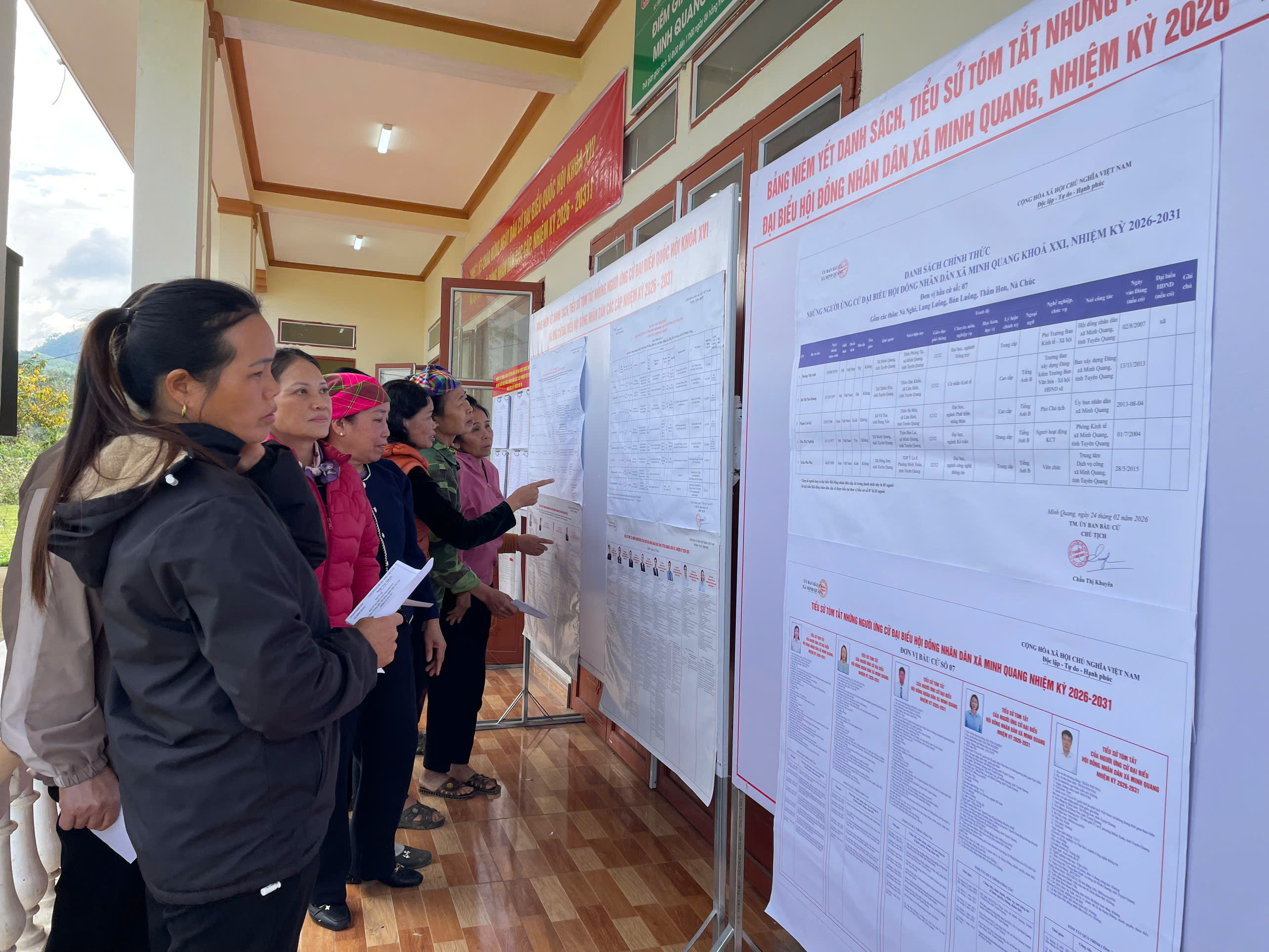 Cử tri thôn Nà Nghè, xã Minh Quang tìm hiểu thông tin tiểu sử các ứng cử viên đại biểu Quốc hội và đại biểu HĐND các cấp tại khu vực bỏ phiếu số 18