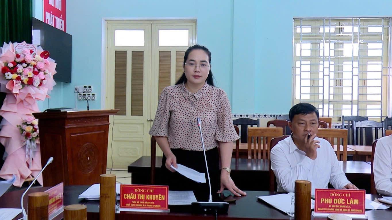 Đồng chí Chẩu Thị Khuyên, Phó Bí thư Đảng uỷ, Chủ tịch UBND xã báo cáo tình hình triển khai các dự án thuộc chương trình MTQG phát triển KT -XH vùng đồng bào DTTS trên địa bàn