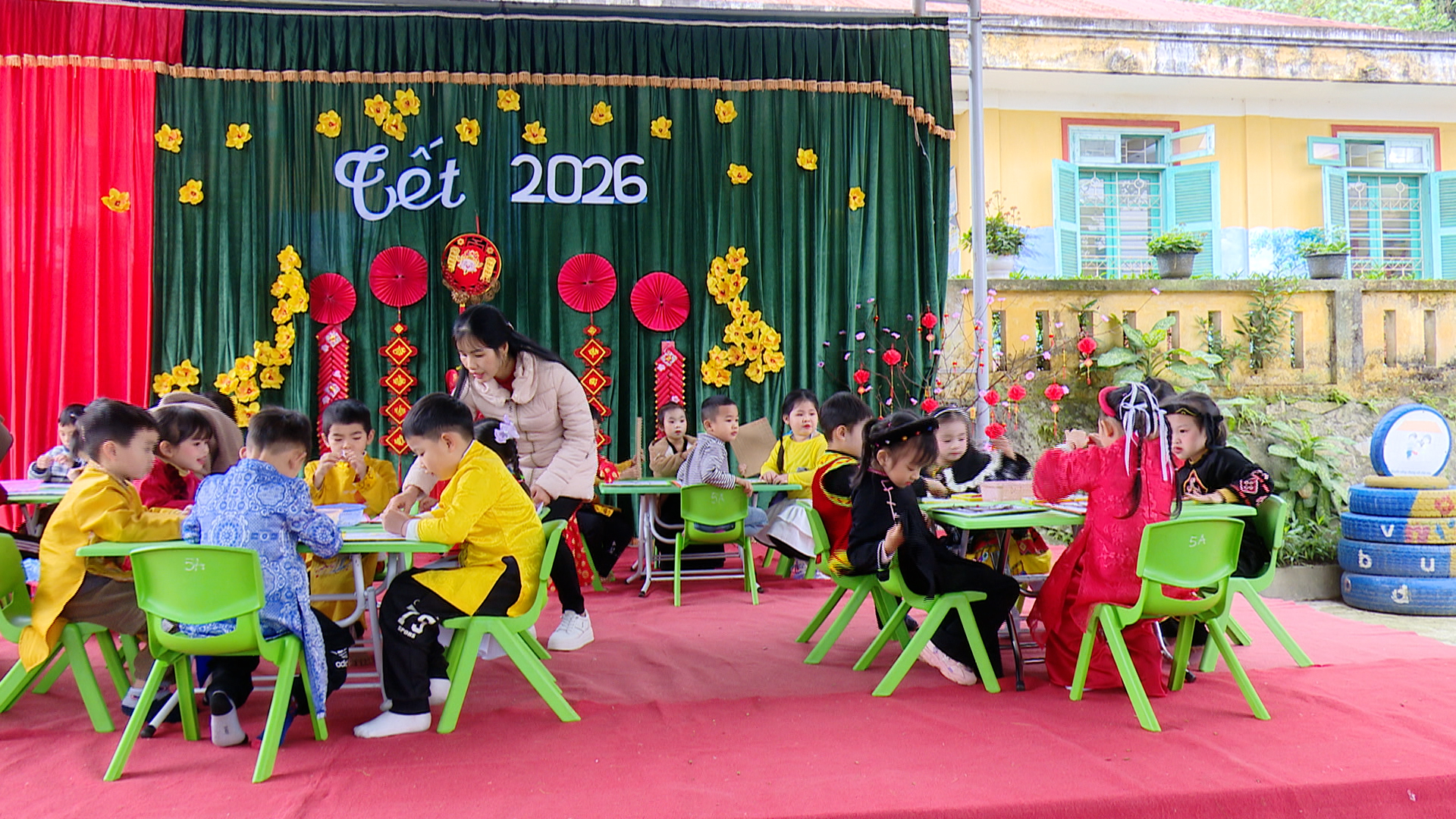 Trong không gian rộn ràng sắc xuân, các bé được cùng cô giáo tham gia nhiều hoạt động phong phú, ý nghĩa như: biểu diễn văn nghệ mừng xuân, trải nghiệm dán hoa ngày Tết; làm pháo Tết; trang trí cành đào ngày Tết, góp phần giúp trẻ hiểu thêm về nét đẹp văn hóa truyền thống của dân tộc.