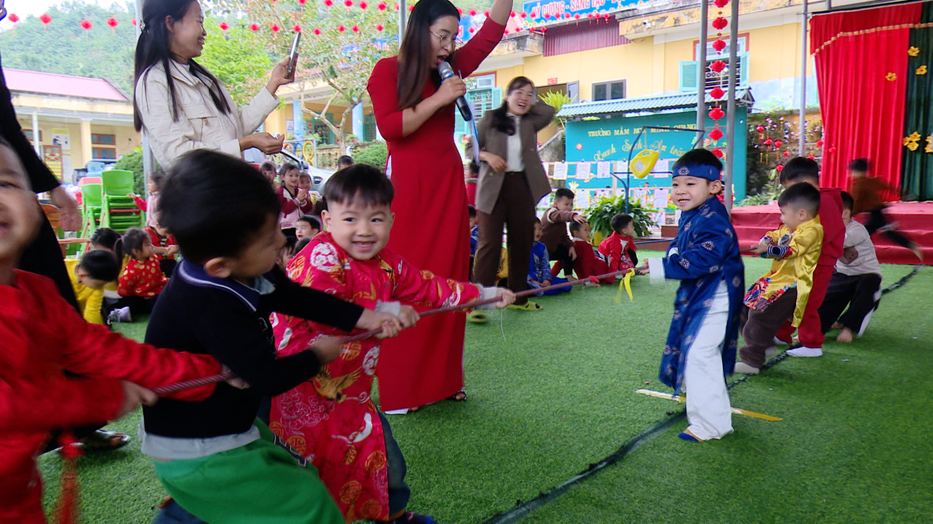 Bên cạnh đó, nhà trường tổ chức các trò chơi dân gian như: bịt mắt đập niêu, tung còn, nhảy sạp, kéo co… dành cho toàn bộ học sinh khối mẫu giáo. Thông qua các trò chơi, trẻ không chỉ được vui chơi, vận động mà còn hình thành tinh thần đoàn kết, kỹ năng giao tiếp và sự tự tin trong các hoạt động tập thể.